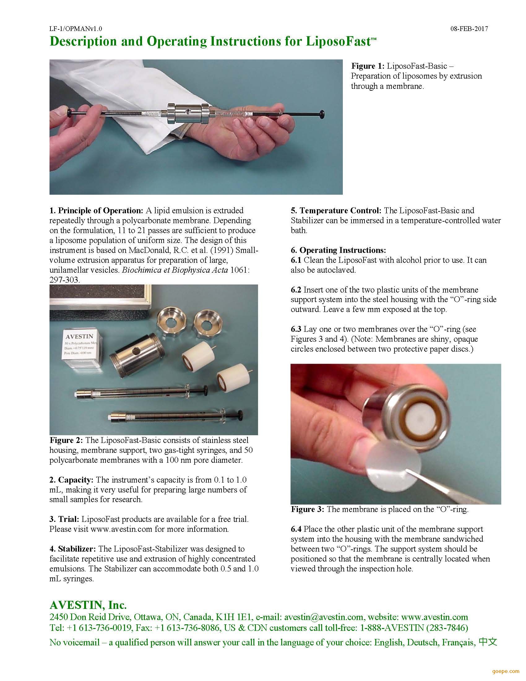 产品描述:Avestin LF-1采用密封的玻璃注射器,利用手动推力,使物料强制通过基体内部的聚碳酸酯膜(径迹蚀刻膜),从而得到均匀的大单室脂质体、纳米粒等。